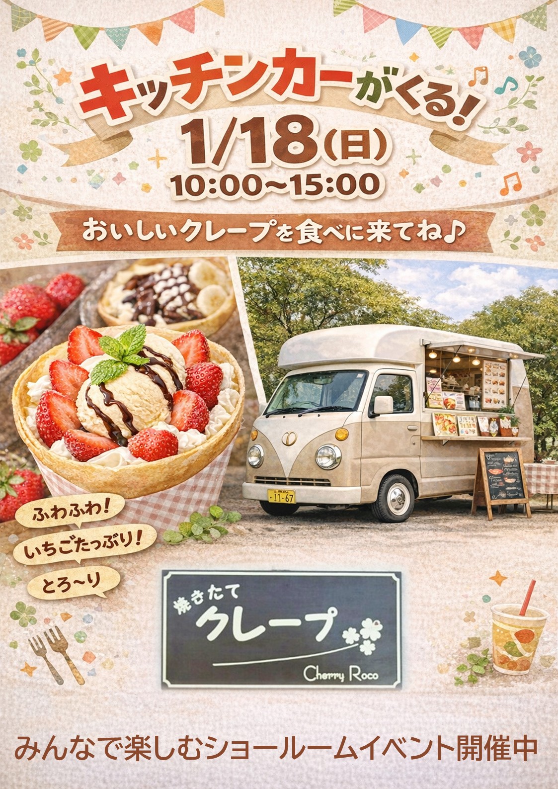 1/18(日)はおいしいクレープのキッチンカーが出店します!