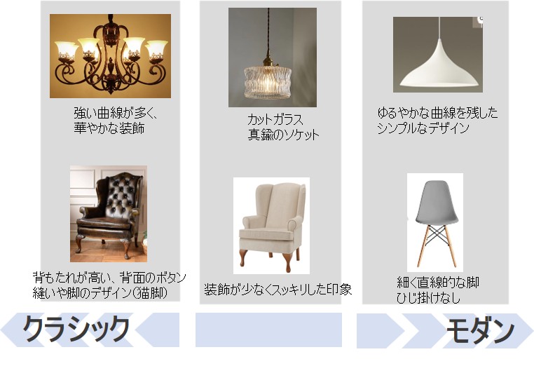 下の表は照明と椅子をクラシック⇔モダンで分類したものです。